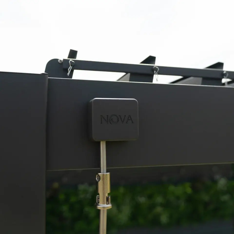 Nova Titan Pergolas close up of roof operating system and box. on Grey Titan Pergola and louvers open with white sky.