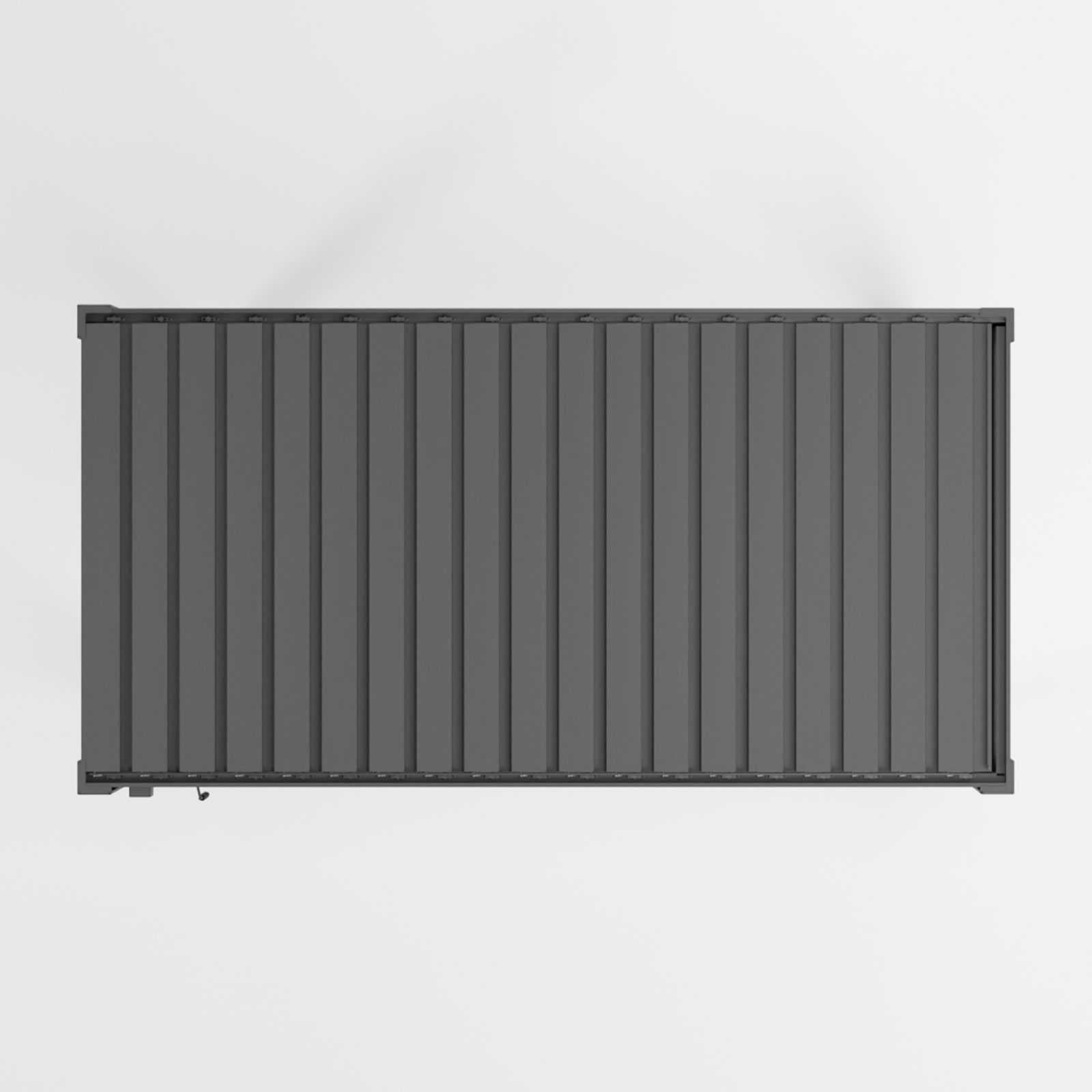 Titan Pergola Grey, corner section with louvers open showing daylight though. Blue/white sky.